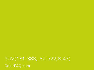 YUV 181.388,-82.522,8.43 Color is a normal yellow color and the nearest color is Rio Grande #bbd009. Hex code #bfd10e and RGB value is rgb(191,209,14). In RGB color space, this color is composed of 75% red, 82% green, 5% blue, In CMYK color space, this color is composed of 9% cyan, 0% magenta, 93% yellow , 18% black , In HSL color space, this color has a hue angle of 66° , 87% saturation and 44% lightness.