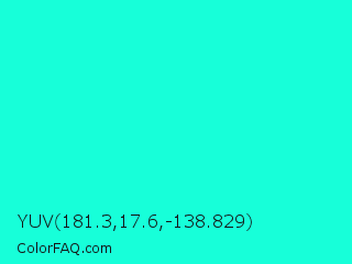 YUV 181.3,17.6,-138.829 Color is a normal cyan color and the nearest color is Bright Turquoise #08e8de. Hex code #17ffd9 and RGB value is rgb(23,255,217). In RGB color space, this color is composed of 9% red, 100% green, 85% blue, In CMYK color space, this color is composed of 91% cyan, 0% magenta, 15% yellow , 0% black , In HSL color space, this color has a hue angle of 170° , 100% saturation and 55% lightness.