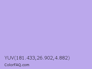 YUV 181.433,26.902,4.882 Color is a light indigo color and the nearest color is Biloba Flower #b2a1ea. Hex code #bba8ec and RGB value is rgb(187,168,236). In RGB color space, this color is composed of 73% red, 66% green, 93% blue, In CMYK color space, this color is composed of 21% cyan, 29% magenta, 0% yellow , 7% black , In HSL color space, this color has a hue angle of 257° , 64% saturation and 79% lightness.