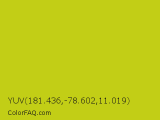 YUV 181.436,-78.602,11.019 Color is a normal yellow color and the nearest color is Key Lime Pie #bfc921. Hex code #c2ce16 and RGB value is rgb(194,206,22). In RGB color space, this color is composed of 76% red, 81% green, 9% blue, In CMYK color space, this color is composed of 6% cyan, 0% magenta, 89% yellow , 19% black , In HSL color space, this color has a hue angle of 64° , 81% saturation and 45% lightness.