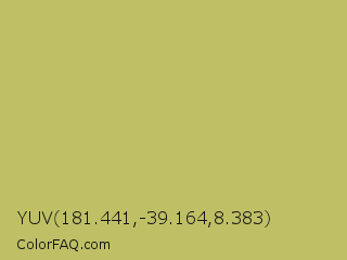 YUV 181.441,-39.164,8.383 Color is a normal yellow color and the nearest color is Wild Willow #b9c46a. Hex code #bfc066 and RGB value is rgb(191,192,102). In RGB color space, this color is composed of 75% red, 75% green, 40% blue, In CMYK color space, this color is composed of 1% cyan, 0% magenta, 47% yellow , 25% black , In HSL color space, this color has a hue angle of 61° , 42% saturation and 58% lightness.