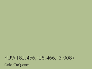 YUV 181.456,-18.466,-3.908 Color is a light lime color and the nearest color is Swamp Green #acb78e. Hex code #b1bf90 and RGB value is rgb(177,191,144). In RGB color space, this color is composed of 69% red, 75% green, 56% blue, In CMYK color space, this color is composed of 7% cyan, 0% magenta, 25% yellow , 25% black , In HSL color space, this color has a hue angle of 78° , 27% saturation and 66% lightness.