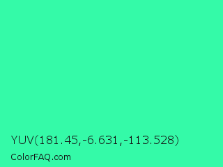 YUV 181.45,-6.631,-113.528 Color is a normal green color and the nearest color is Eucalyptus #44d7a8. Hex code #34faa8 and RGB value is rgb(52,250,168). In RGB color space, this color is composed of 20% red, 98% green, 66% blue, In CMYK color space, this color is composed of 79% cyan, 0% magenta, 33% yellow , 2% black , In HSL color space, this color has a hue angle of 155° , 95% saturation and 59% lightness.