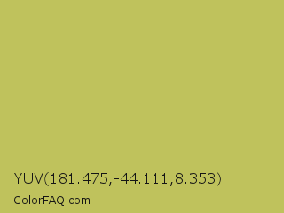 YUV 181.475,-44.111,8.353 Color is a normal yellow color and the nearest color is Celery #b8c25d. Hex code #bfc25c and RGB value is rgb(191,194,92). In RGB color space, this color is composed of 75% red, 76% green, 36% blue, In CMYK color space, this color is composed of 2% cyan, 0% magenta, 53% yellow , 24% black , In HSL color space, this color has a hue angle of 62° , 46% saturation and 56% lightness.