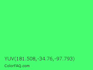 YUV 181.508,-34.76,-97.793 Color is a light green color and the nearest color is Screamin Green #66ff66. Hex code #46fc6f and RGB value is rgb(70,252,111). In RGB color space, this color is composed of 27% red, 99% green, 44% blue, In CMYK color space, this color is composed of 72% cyan, 0% magenta, 56% yellow , 1% black , In HSL color space, this color has a hue angle of 134° , 97% saturation and 63% lightness.