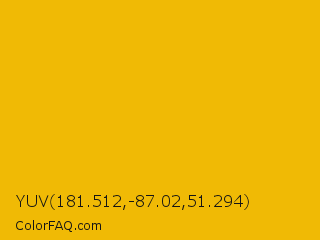 YUV 181.512,-87.02,51.294 Color is a normal yellow color and the nearest color is Corn #e7bf05. Hex code #f0ba05 and RGB value is rgb(240,186,5). In RGB color space, this color is composed of 94% red, 73% green, 2% blue, In CMYK color space, this color is composed of 0% cyan, 23% magenta, 98% yellow , 6% black , In HSL color space, this color has a hue angle of 46° , 96% saturation and 48% lightness.