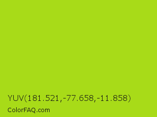 YUV 181.521,-77.658,-11.858 Color is a normal lime color and the nearest color is Inch Worm #b0e313. Hex code #a8db18 and RGB value is rgb(168,219,24). In RGB color space, this color is composed of 66% red, 86% green, 9% blue, In CMYK color space, this color is composed of 23% cyan, 0% magenta, 89% yellow , 14% black , In HSL color space, this color has a hue angle of 76° , 80% saturation and 48% lightness.