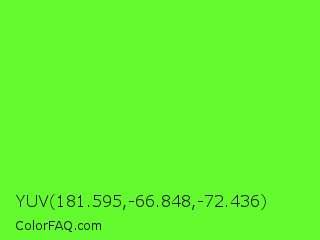 YUV 181.595,-66.848,-72.436 Color is a normal green color and the nearest color is Spring Frost #87ff2a. Hex code #63fa2e and RGB value is rgb(99,250,46). In RGB color space, this color is composed of 39% red, 98% green, 18% blue, In CMYK color space, this color is composed of 60% cyan, 0% magenta, 82% yellow , 2% black , In HSL color space, this color has a hue angle of 104° , 95% saturation and 58% lightness.