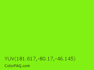 YUV 181.617,-80.17,-46.145 Color is a normal green color and the nearest color is Lawn Green #7cfc00. Hex code #81f013 and RGB value is rgb(129,240,19). In RGB color space, this color is composed of 51% red, 94% green, 7% blue, In CMYK color space, this color is composed of 46% cyan, 0% magenta, 92% yellow , 6% black , In HSL color space, this color has a hue angle of 90° , 88% saturation and 51% lightness.