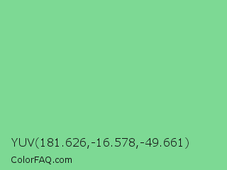 YUV 181.626,-16.578,-49.661 Color is a light green color and the nearest color is De York #7ac488. Hex code #7dd994 and RGB value is rgb(125,217,148). In RGB color space, this color is composed of 49% red, 85% green, 58% blue, In CMYK color space, this color is composed of 42% cyan, 0% magenta, 32% yellow , 15% black , In HSL color space, this color has a hue angle of 135° , 55% saturation and 67% lightness.