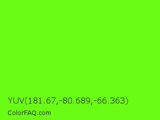 YUV 181.67,-80.689,-66.363 Color is a normal green color and the nearest color is Bright Green #66ff00. Hex code #6afc12 and RGB value is rgb(106,252,18). In RGB color space, this color is composed of 42% red, 99% green, 7% blue, In CMYK color space, this color is composed of 58% cyan, 0% magenta, 93% yellow , 1% black , In HSL color space, this color has a hue angle of 97° , 98% saturation and 53% lightness.