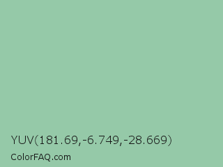 YUV 181.69,-6.749,-28.669 Color is a light green color and the nearest color is Eton Blue #96c8a2. Hex code #95c9a8 and RGB value is rgb(149,201,168). In RGB color space, this color is composed of 58% red, 79% green, 66% blue, In CMYK color space, this color is composed of 26% cyan, 0% magenta, 16% yellow , 21% black , In HSL color space, this color has a hue angle of 142° , 33% saturation and 69% lightness.