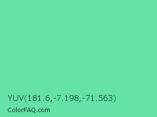 YUV 181.6,-7.198,-71.563 Color is a light green color and the nearest color is Medium Aquamarine #66ddaa. Hex code #64e2a7 and RGB value is rgb(100,226,167). In RGB color space, this color is composed of 39% red, 89% green, 65% blue, In CMYK color space, this color is composed of 56% cyan, 0% magenta, 26% yellow , 11% black , In HSL color space, this color has a hue angle of 152° , 68% saturation and 64% lightness.