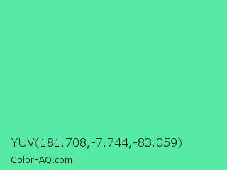 YUV 181.708,-7.744,-83.059 Color is a light green color and the nearest color is Medium Aquamarine #66ddaa. Hex code #57e9a6 and RGB value is rgb(87,233,166). In RGB color space, this color is composed of 34% red, 91% green, 65% blue, In CMYK color space, this color is composed of 63% cyan, 0% magenta, 29% yellow , 9% black , In HSL color space, this color has a hue angle of 152° , 77% saturation and 63% lightness.