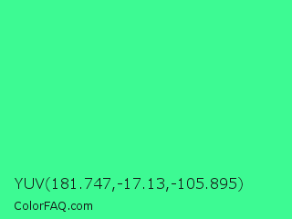 YUV 181.747,-17.13,-105.895 Color is a light green color and the nearest color is Eucalyptus #44d7a8. Hex code #3dfa93 and RGB value is rgb(61,250,147). In RGB color space, this color is composed of 24% red, 98% green, 58% blue, In CMYK color space, this color is composed of 76% cyan, 0% magenta, 41% yellow , 2% black , In HSL color space, this color has a hue angle of 147° , 95% saturation and 61% lightness.
