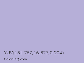 YUV 181.767,16.877,0.204 Color is a light indigo color and the nearest color is Lavender Gray #bdbbd7. Hex code #b6afd8 and RGB value is rgb(182,175,216). In RGB color space, this color is composed of 71% red, 69% green, 85% blue, In CMYK color space, this color is composed of 16% cyan, 19% magenta, 0% yellow , 15% black , In HSL color space, this color has a hue angle of 250° , 34% saturation and 77% lightness.