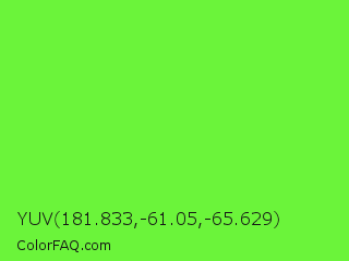 YUV 181.833,-61.05,-65.629 Color is a normal green color and the nearest color is Spring Frost #87ff2a. Hex code #6bf43a and RGB value is rgb(107,244,58). In RGB color space, this color is composed of 42% red, 96% green, 23% blue, In CMYK color space, this color is composed of 56% cyan, 0% magenta, 76% yellow , 4% black , In HSL color space, this color has a hue angle of 104° , 89% saturation and 59% lightness.