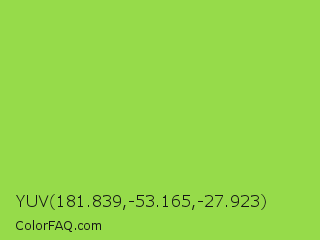 YUV 181.839,-53.165,-27.923 Color is a normal green color and the nearest color is Kiwi #8ee53f. Hex code #96db4a and RGB value is rgb(150,219,74). In RGB color space, this color is composed of 59% red, 86% green, 29% blue, In CMYK color space, this color is composed of 32% cyan, 0% magenta, 66% yellow , 14% black , In HSL color space, this color has a hue angle of 89° , 67% saturation and 57% lightness.