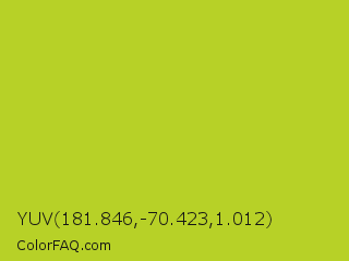 YUV 181.846,-70.423,1.012 Color is a normal yellow color and the nearest color is Key Lime Pie #bfc921. Hex code #b7d127 and RGB value is rgb(183,209,39). In RGB color space, this color is composed of 72% red, 82% green, 15% blue, In CMYK color space, this color is composed of 12% cyan, 0% magenta, 81% yellow , 18% black , In HSL color space, this color has a hue angle of 69° , 69% saturation and 49% lightness.
