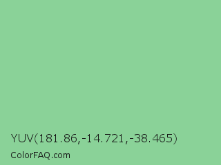 YUV 181.86,-14.721,-38.465 Color is a light green color and the nearest color is Eton Blue #96c8a2. Hex code #8ad298 and RGB value is rgb(138,210,152). In RGB color space, this color is composed of 54% red, 82% green, 60% blue, In CMYK color space, this color is composed of 34% cyan, 0% magenta, 28% yellow , 18% black , In HSL color space, this color has a hue angle of 132° , 44% saturation and 68% lightness.