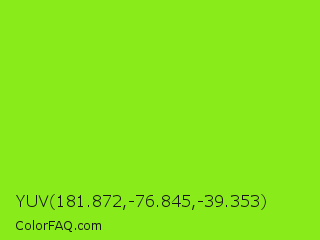 YUV 181.872,-76.845,-39.353 Color is a normal green color and the nearest color is Spring Frost #87ff2a. Hex code #89eb1a and RGB value is rgb(137,235,26). In RGB color space, this color is composed of 54% red, 92% green, 10% blue, In CMYK color space, this color is composed of 42% cyan, 0% magenta, 89% yellow , 8% black , In HSL color space, this color has a hue angle of 88° , 84% saturation and 51% lightness.