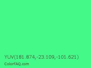 YUV 181.874,-23.109,-101.621 Color is a light green color and the nearest color is Very Light Malachite Green #64e986. Hex code #42fa87 and RGB value is rgb(66,250,135). In RGB color space, this color is composed of 26% red, 98% green, 53% blue, In CMYK color space, this color is composed of 74% cyan, 0% magenta, 46% yellow , 2% black , In HSL color space, this color has a hue angle of 143° , 95% saturation and 62% lightness.