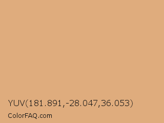 YUV 181.891,-28.047,36.053 Color is a light orange color and the nearest color is Tumbleweed #dea681. Hex code #dfac7d and RGB value is rgb(223,172,125). In RGB color space, this color is composed of 87% red, 67% green, 49% blue, In CMYK color space, this color is composed of 0% cyan, 23% magenta, 44% yellow , 13% black , In HSL color space, this color has a hue angle of 29° , 60% saturation and 68% lightness.