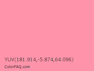 YUV 181.914,-5.874,64.096 Color is a light red color and the nearest color is Schauss Pink #ff91af. Hex code #ff93aa and RGB value is rgb(255,147,170). In RGB color space, this color is composed of 100% red, 58% green, 67% blue, In CMYK color space, this color is composed of 0% cyan, 42% magenta, 33% yellow , 0% black , In HSL color space, this color has a hue angle of 347° , 100% saturation and 79% lightness.