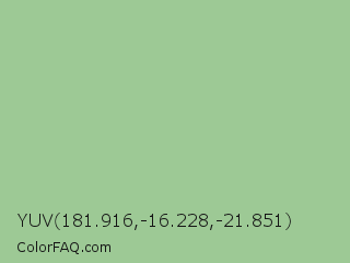 YUV 181.916,-16.228,-21.851 Color is a light green color and the nearest color is Eton Blue #96c8a2. Hex code #9dc995 and RGB value is rgb(157,201,149). In RGB color space, this color is composed of 62% red, 79% green, 58% blue, In CMYK color space, this color is composed of 22% cyan, 0% magenta, 26% yellow , 21% black , In HSL color space, this color has a hue angle of 111° , 33% saturation and 69% lightness.