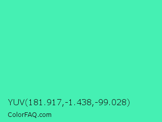 YUV 181.917,-1.438,-99.028 Color is a light green color and the nearest color is Eucalyptus #44d7a8. Hex code #45f0b3 and RGB value is rgb(69,240,179). In RGB color space, this color is composed of 27% red, 94% green, 70% blue, In CMYK color space, this color is composed of 71% cyan, 0% magenta, 25% yellow , 6% black , In HSL color space, this color has a hue angle of 159° , 85% saturation and 61% lightness.