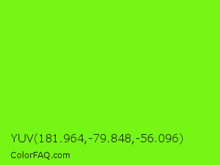 YUV 181.964,-79.848,-56.096 Color is a normal green color and the nearest color is Lawn Green #7cfc00. Hex code #76f614 and RGB value is rgb(118,246,20). In RGB color space, this color is composed of 46% red, 96% green, 8% blue, In CMYK color space, this color is composed of 52% cyan, 0% magenta, 92% yellow , 4% black , In HSL color space, this color has a hue angle of 94° , 93% saturation and 52% lightness.