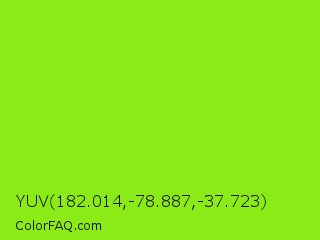 YUV 182.014,-78.887,-37.723 Color is a normal green color and the nearest color is Alien Armpit #84de02. Hex code #8beb16 and RGB value is rgb(139,235,22). In RGB color space, this color is composed of 55% red, 92% green, 9% blue, In CMYK color space, this color is composed of 41% cyan, 0% magenta, 91% yellow , 8% black , In HSL color space, this color has a hue angle of 87° , 84% saturation and 50% lightness.