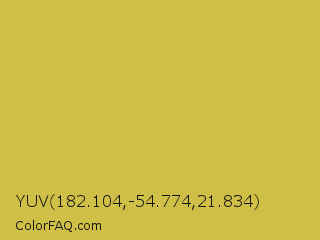 YUV 182.104,-54.774,21.834 Color is a normal yellow color and the nearest color is Turmeric #cabb48. Hex code #cfbf47 and RGB value is rgb(207,191,71). In RGB color space, this color is composed of 81% red, 75% green, 28% blue, In CMYK color space, this color is composed of 0% cyan, 8% magenta, 66% yellow , 19% black , In HSL color space, this color has a hue angle of 53° , 59% saturation and 55% lightness.