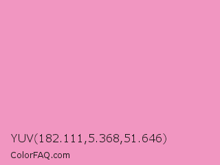 YUV 182.111,5.368,51.646 Color is a light rose color and the nearest color is Pastel Magenta #f49ac2. Hex code #f196c1 and RGB value is rgb(241,150,193). In RGB color space, this color is composed of 95% red, 59% green, 76% blue, In CMYK color space, this color is composed of 0% cyan, 38% magenta, 20% yellow , 5% black , In HSL color space, this color has a hue angle of 332° , 76% saturation and 77% lightness.