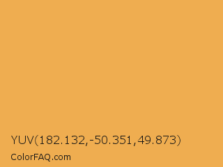 YUV 182.132,-50.351,49.873 Color is a light orange color and the nearest color is Sunray #e3ab57. Hex code #efad50 and RGB value is rgb(239,173,80). In RGB color space, this color is composed of 94% red, 68% green, 31% blue, In CMYK color space, this color is composed of 0% cyan, 28% magenta, 67% yellow , 6% black , In HSL color space, this color has a hue angle of 35° , 83% saturation and 63% lightness.
