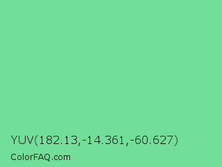 YUV 182.13,-14.361,-60.627 Color is a light green color and the nearest color is Medium Aquamarine #66ddaa. Hex code #71df99 and RGB value is rgb(113,223,153). In RGB color space, this color is composed of 44% red, 87% green, 60% blue, In CMYK color space, this color is composed of 49% cyan, 0% magenta, 31% yellow , 13% black , In HSL color space, this color has a hue angle of 142° , 63% saturation and 66% lightness.