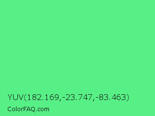 YUV 182.169,-23.747,-83.463 Color is a light green color and the nearest color is Very Light Malachite Green #64e986. Hex code #57f086 and RGB value is rgb(87,240,134). In RGB color space, this color is composed of 34% red, 94% green, 53% blue, In CMYK color space, this color is composed of 64% cyan, 0% magenta, 44% yellow , 6% black , In HSL color space, this color has a hue angle of 138° , 84% saturation and 64% lightness.