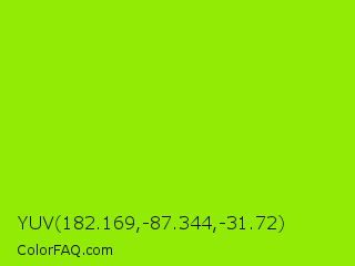 YUV 182.169,-87.344,-31.72 Color is a normal green color and the nearest color is Alien Armpit #84de02. Hex code #92eb05 and RGB value is rgb(146,235,5). In RGB color space, this color is composed of 57% red, 92% green, 2% blue, In CMYK color space, this color is composed of 38% cyan, 0% magenta, 98% yellow , 8% black , In HSL color space, this color has a hue angle of 83° , 96% saturation and 47% lightness.