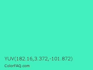 YUV 182.16,3.372,-101.872 Color is a normal green color and the nearest color is Turquoise #40e0d0. Hex code #42f0bd and RGB value is rgb(66,240,189). In RGB color space, this color is composed of 26% red, 94% green, 74% blue, In CMYK color space, this color is composed of 73% cyan, 0% magenta, 21% yellow , 6% black , In HSL color space, this color has a hue angle of 162° , 85% saturation and 60% lightness.