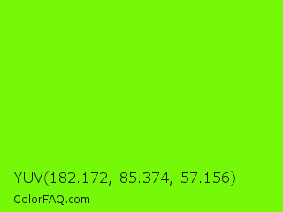 YUV 182.172,-85.374,-57.156 Color is a normal green color and the nearest color is Lawn Green #7cfc00. Hex code #75f909 and RGB value is rgb(117,249,9). In RGB color space, this color is composed of 46% red, 98% green, 4% blue, In CMYK color space, this color is composed of 53% cyan, 0% magenta, 96% yellow , 2% black , In HSL color space, this color has a hue angle of 93° , 95% saturation and 51% lightness.