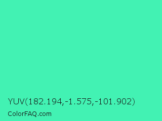 YUV 182.194,-1.575,-101.902 Color is a normal green color and the nearest color is Eucalyptus #44d7a8. Hex code #42f2b3 and RGB value is rgb(66,242,179). In RGB color space, this color is composed of 26% red, 95% green, 70% blue, In CMYK color space, this color is composed of 73% cyan, 0% magenta, 26% yellow , 5% black , In HSL color space, this color has a hue angle of 159° , 87% saturation and 60% lightness.