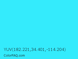 YUV 182.221,34.401,-114.204 Color is a normal cyan color and the nearest color is Loeen #15f2fd. Hex code #34ebfc and RGB value is rgb(52,235,252). In RGB color space, this color is composed of 20% red, 92% green, 99% blue, In CMYK color space, this color is composed of 79% cyan, 7% magenta, 0% yellow , 1% black , In HSL color space, this color has a hue angle of 185° , 97% saturation and 60% lightness.