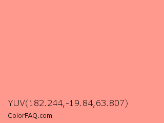 YUV 182.244,-19.84,63.807 Color is a light red color and the nearest color is Vivid Tangerine #ffa089. Hex code #ff998e and RGB value is rgb(255,153,142). In RGB color space, this color is composed of 100% red, 60% green, 56% blue, In CMYK color space, this color is composed of 0% cyan, 40% magenta, 44% yellow , 0% black , In HSL color space, this color has a hue angle of 6° , 100% saturation and 78% lightness.
