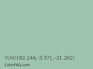 YUV 182.244,-3.571,-21.262 Color is a light green color and the nearest color is Cambridge Blue #a3c1ad. Hex code #9ec4af and RGB value is rgb(158,196,175). In RGB color space, this color is composed of 62% red, 77% green, 69% blue, In CMYK color space, this color is composed of 19% cyan, 0% magenta, 11% yellow , 23% black , In HSL color space, this color has a hue angle of 147° , 24% saturation and 69% lightness.