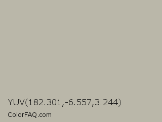 YUV 182.301,-6.557,3.244 Color is a light yellow color and the nearest color is Silk #bdb1a8. Hex code #bab7a9 and RGB value is rgb(186,183,169). In RGB color space, this color is composed of 73% red, 72% green, 66% blue, In CMYK color space, this color is composed of 0% cyan, 2% magenta, 9% yellow , 27% black , In HSL color space, this color has a hue angle of 49° , 11% saturation and 70% lightness.