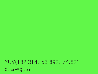 YUV 182.314,-53.892,-74.82 Color is a light green color and the nearest color is Screamin Green #66ff66. Hex code #61f749 and RGB value is rgb(97,247,73). In RGB color space, this color is composed of 38% red, 97% green, 29% blue, In CMYK color space, this color is composed of 61% cyan, 0% magenta, 70% yellow , 3% black , In HSL color space, this color has a hue angle of 112° , 92% saturation and 63% lightness.
