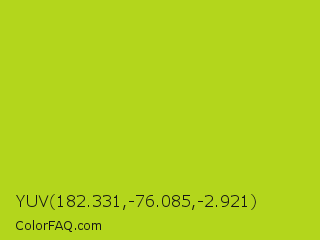 YUV 182.331,-76.085,-2.921 Color is a normal lime color and the nearest color is Inch Worm #b0e313. Hex code #b3d61c and RGB value is rgb(179,214,28). In RGB color space, this color is composed of 70% red, 84% green, 11% blue, In CMYK color space, this color is composed of 16% cyan, 0% magenta, 87% yellow , 16% black , In HSL color space, this color has a hue angle of 71° , 77% saturation and 47% lightness.