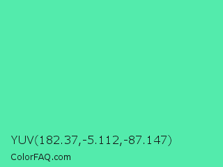 YUV 182.37,-5.112,-87.147 Color is a light green color and the nearest color is Medium Aquamarine #66ddaa. Hex code #53ebac and RGB value is rgb(83,235,172). In RGB color space, this color is composed of 33% red, 92% green, 67% blue, In CMYK color space, this color is composed of 65% cyan, 0% magenta, 27% yellow , 8% black , In HSL color space, this color has a hue angle of 155° , 79% saturation and 62% lightness.