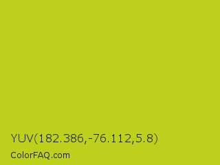 YUV 182.386,-76.112,5.8 Color is a normal yellow color and the nearest color is Key Lime Pie #bfc921. Hex code #bdd11c and RGB value is rgb(189,209,28). In RGB color space, this color is composed of 74% red, 82% green, 11% blue, In CMYK color space, this color is composed of 10% cyan, 0% magenta, 87% yellow , 18% black , In HSL color space, this color has a hue angle of 67° , 76% saturation and 46% lightness.