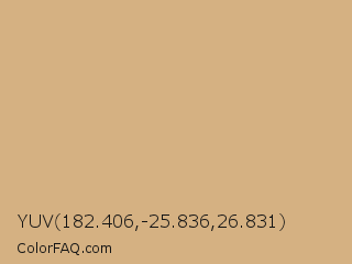 YUV 182.406,-25.836,26.831 Color is a light orange color and the nearest color is Tan #d2b48c. Hex code #d5b182 and RGB value is rgb(213,177,130). In RGB color space, this color is composed of 84% red, 69% green, 51% blue, In CMYK color space, this color is composed of 0% cyan, 17% magenta, 39% yellow , 16% black , In HSL color space, this color has a hue angle of 34° , 50% saturation and 67% lightness.